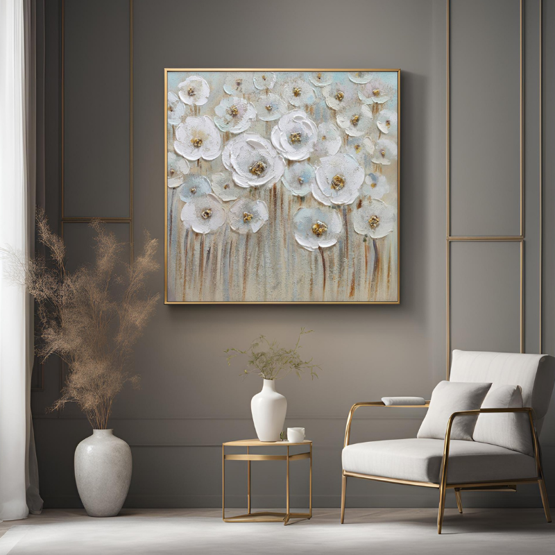 Yağlı Boya Dokulu Kabartmalı Gold Detaylı Çiçekler Tablo 90x90cm